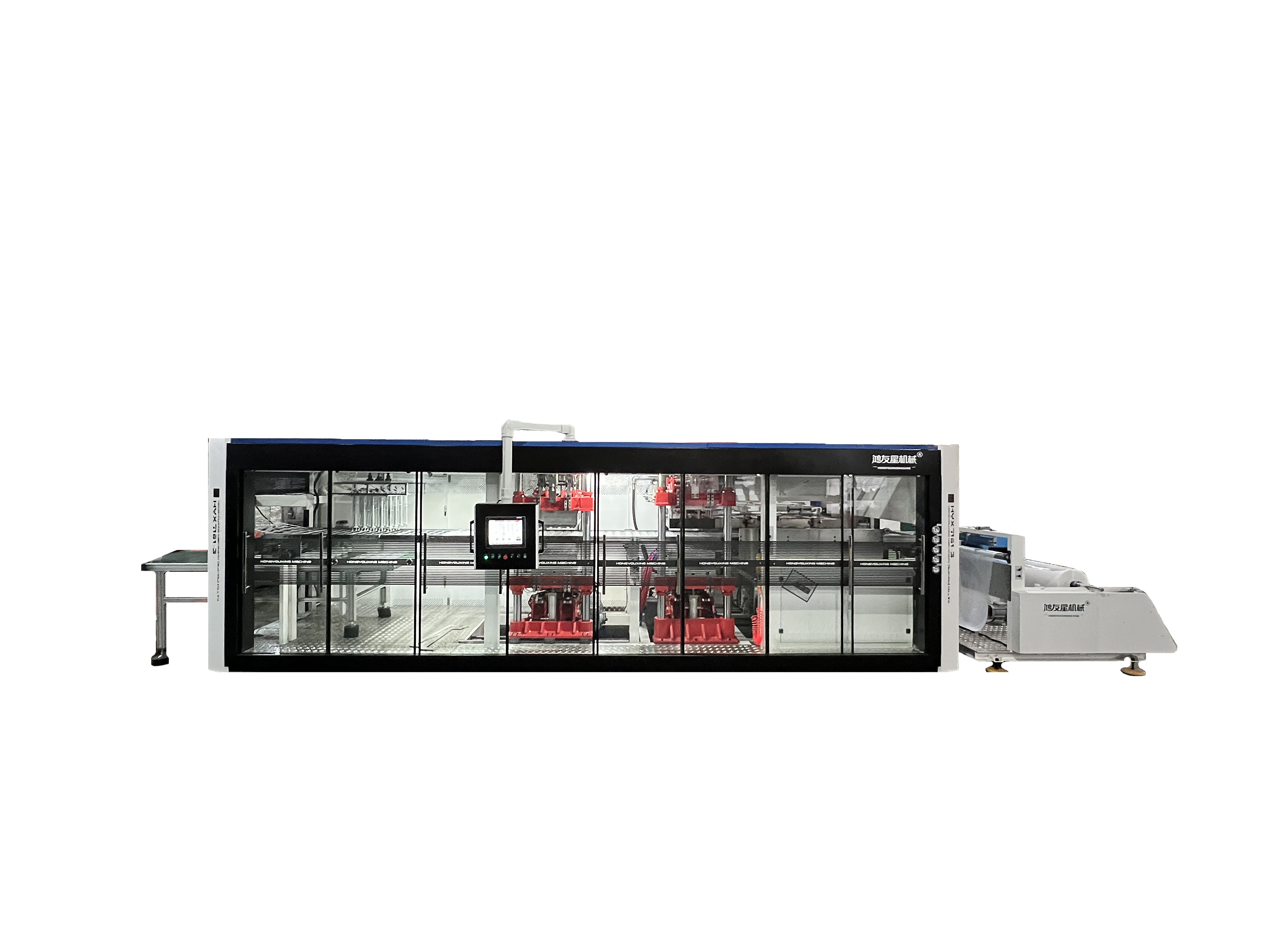 我們的主要產(chǎn)品有 HYX-850全自動正負(fù)壓3/4工位熱成型機(jī)(成型-裁切-沖孔-堆疊)、 HYX-1220 PLC全電腦控制自動真空熱成型機(jī)、 HW-7072負(fù)壓成型裁切一體機(jī)(成型-裁切-堆疊)、 HW-730自動氣壓成型杯蓋碗機(jī)、 厚片吸塑機(jī)、 30-150T液壓裁斷機(jī)、 冷水機(jī)和空壓機(jī)等輔機(jī)、 熱成型模具。